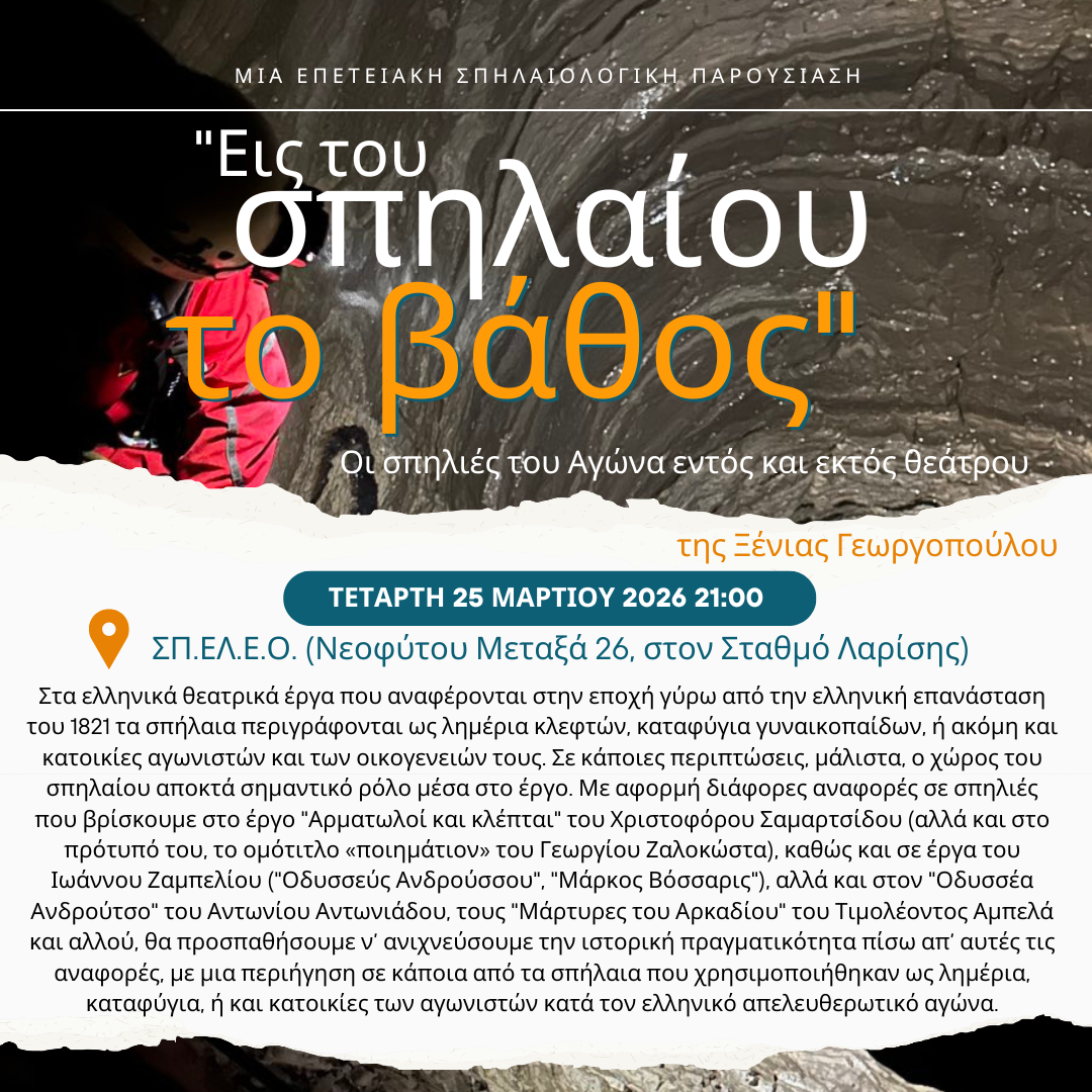 Επετειακή Σπηλαιολογική παρουσίαση Τετάρτη 25η Μαρτίου ώρα 21:00